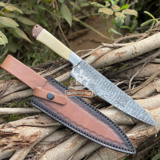 Handmade Damascus Steel Chef Knife | Rosewood & Camel Bone Handle with Leather Sheath | DRSKNIVES HUB
