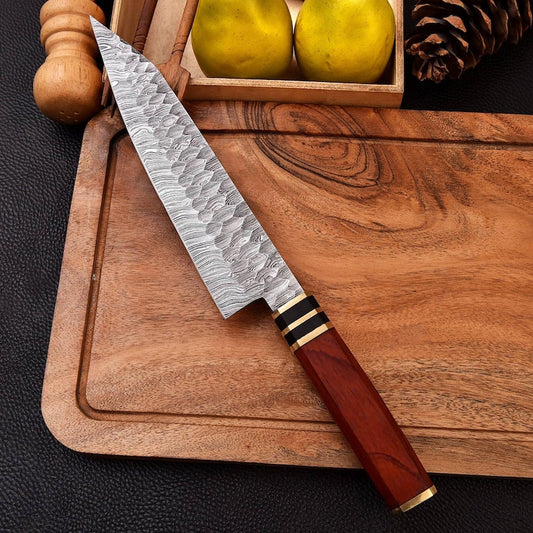 Handmade Carbon Steel Chef Knife: Rosewood Resin Handle & Leather Sheath