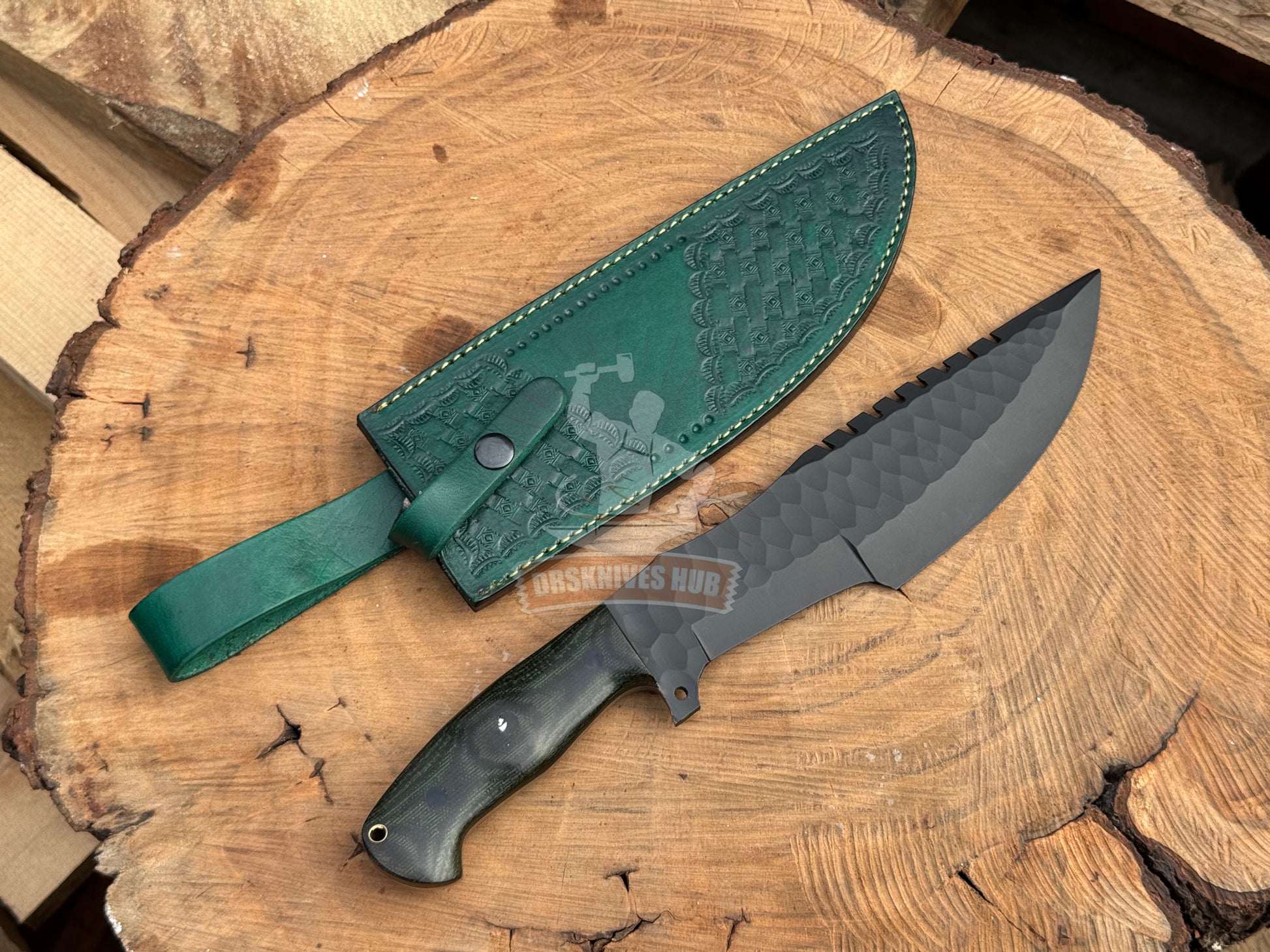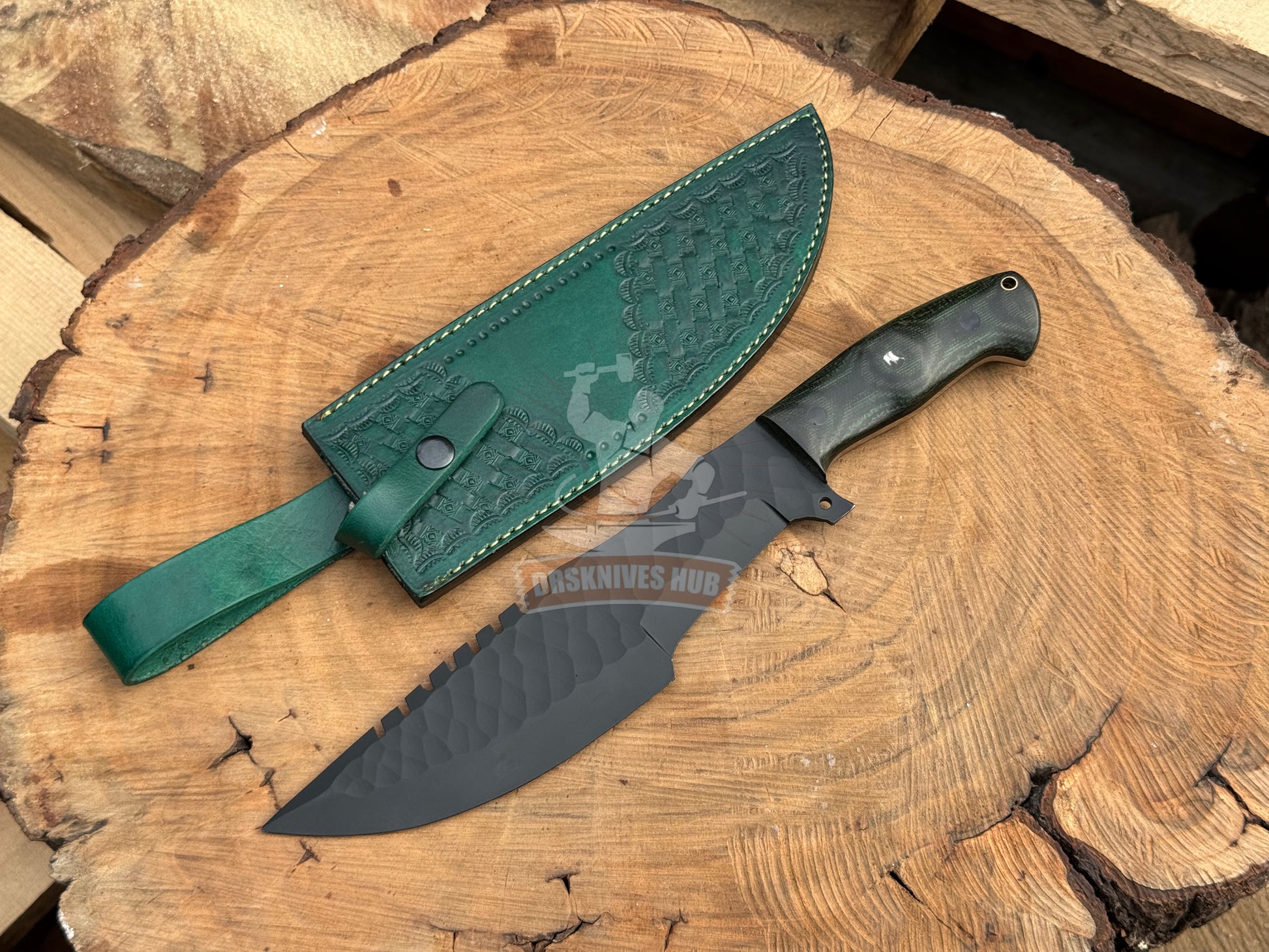 Dominate the wilderness with our custom handmade tracker knife, expertly crafted from black powder-coated 1095 high-carbon steel. This impressive 14-inch tactical tracker combines maximum durability with tactical aesthetics, featuring a robust micarta handle and premium leather sheath, making it the ultimate outdoor gift for hunters, survivalists, and tactical enthusiasts who demand uncompromising performance.