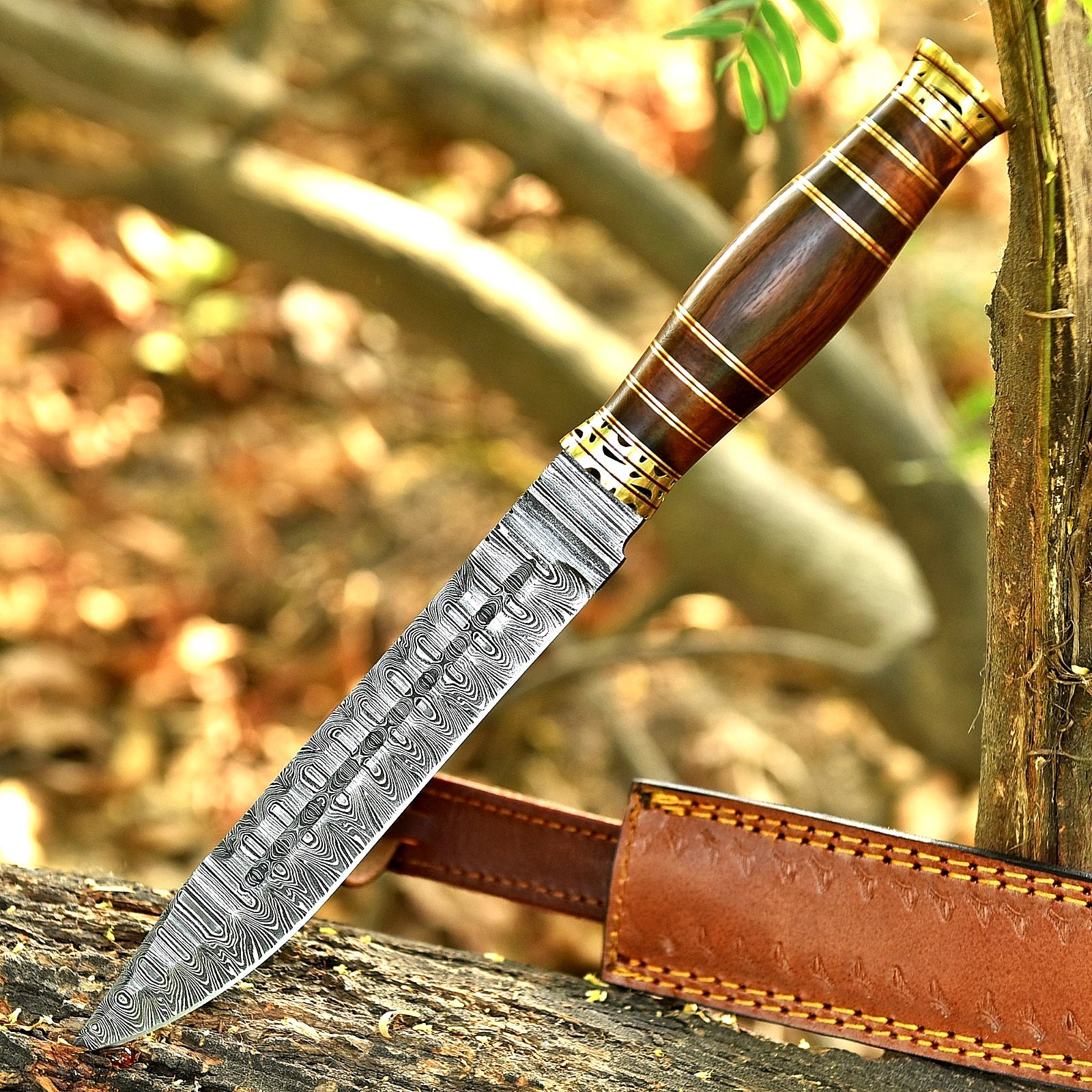 Crafted with a wood and brass handle, this Bowie knife provides excellent balance and a comfortable, secure grip — even under tough conditions. Each knife comes with a premium leather sheath for safe storage and easy carry.