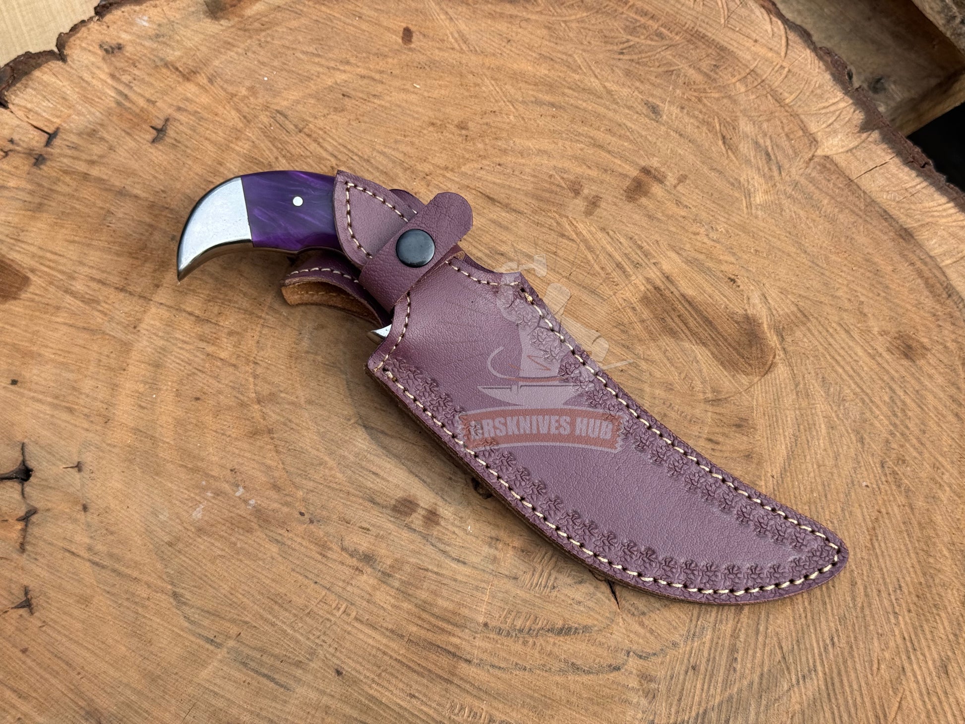 Custom Handmade Damascus Hunting Knife with Resin Handle & Leather Sheath