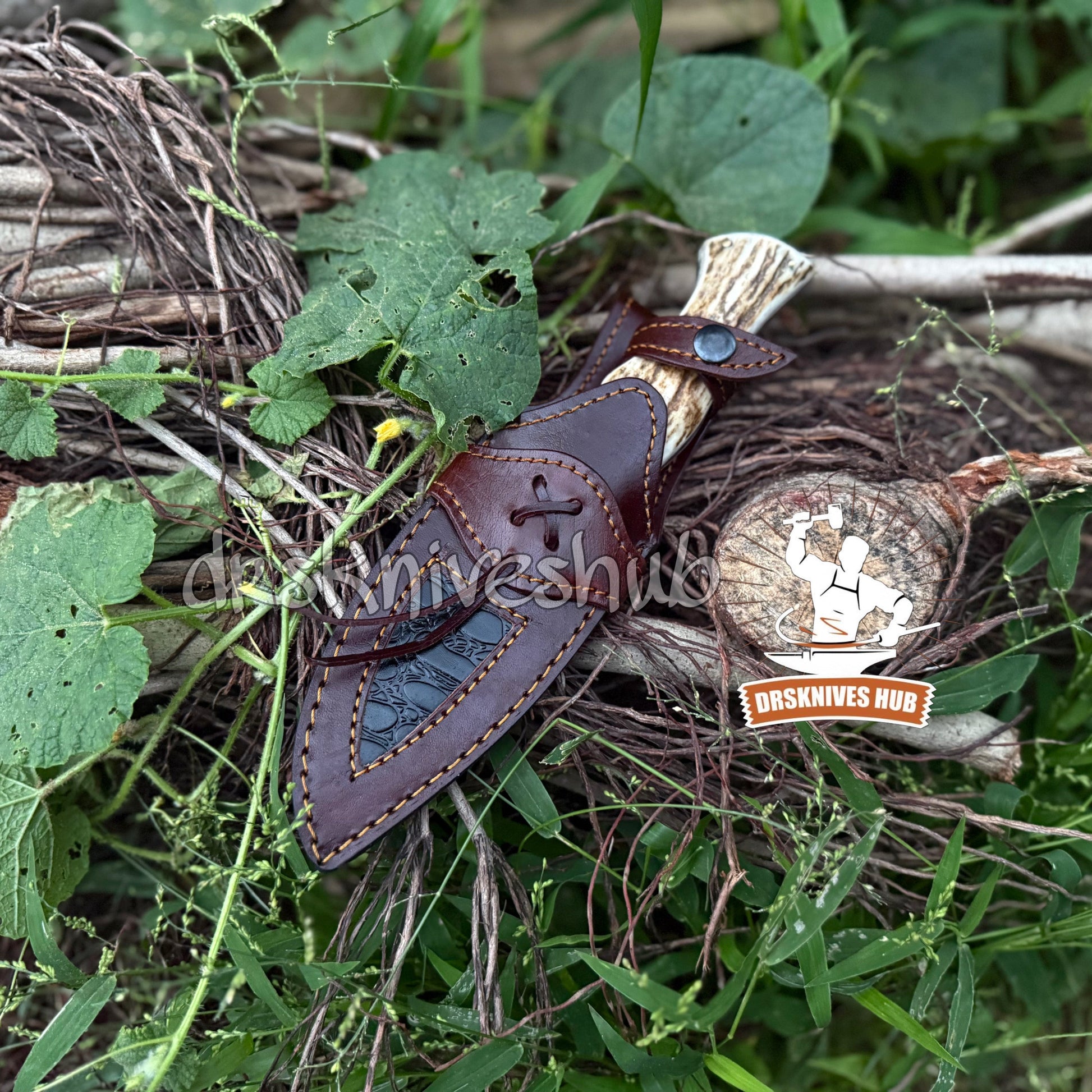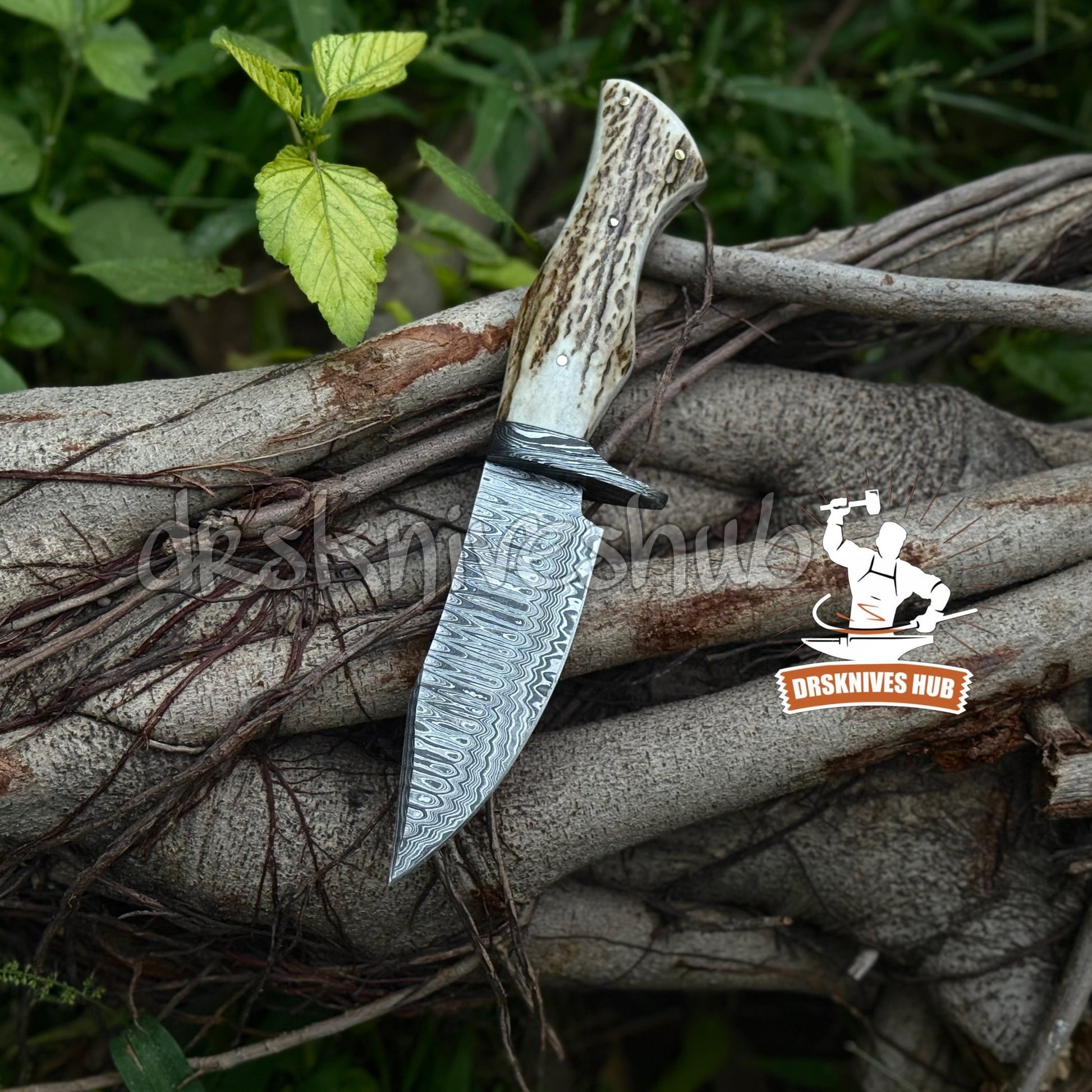 This Damascus steel hunting knife boasts a durable and sharp blade, complemented by a unique antler handle. Perfect for outdoor enthusiasts and hunters, this knife combines the strength of Damascus steel with the natural beauty of antlers. A must-have addition to any hunting or camping gear collection.