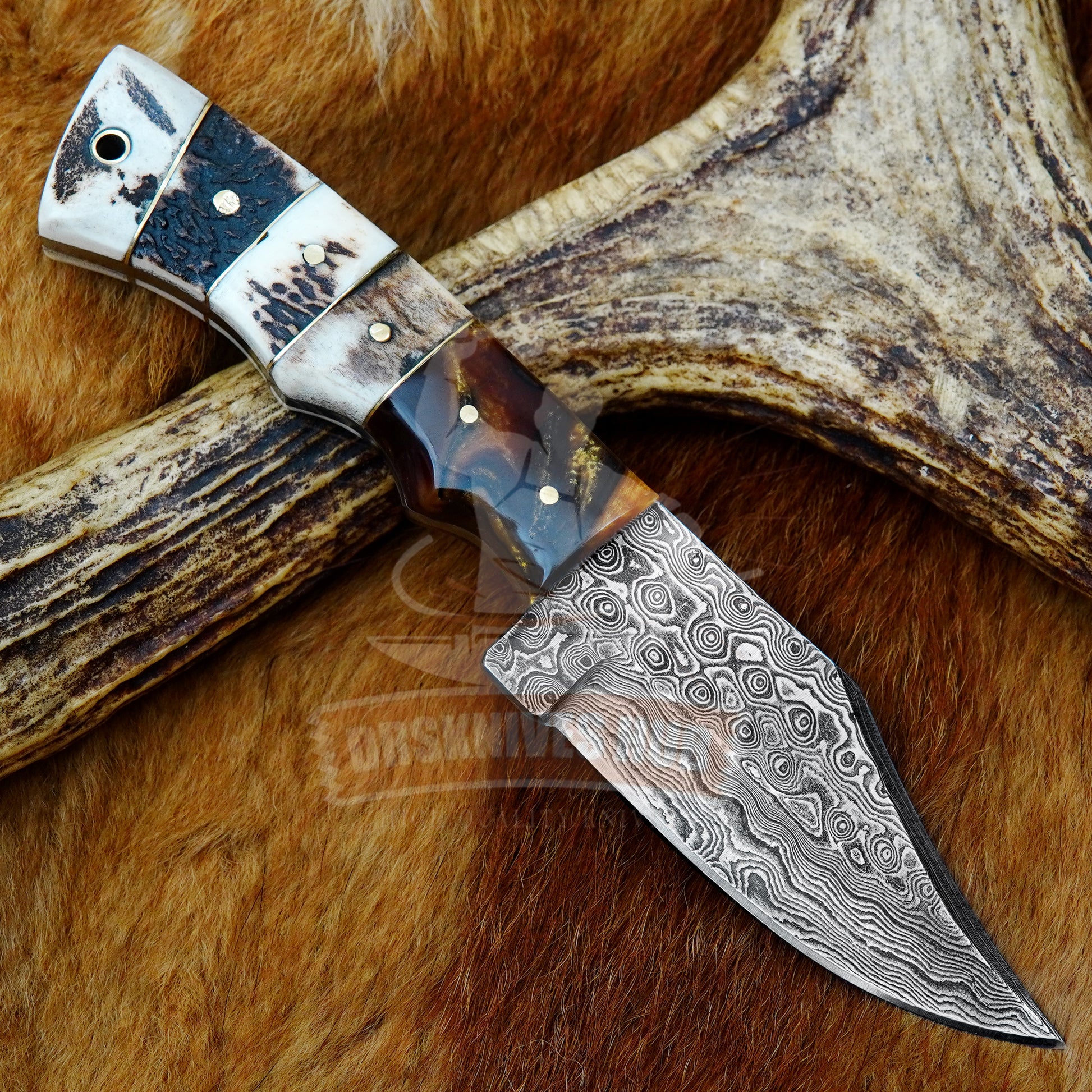 The blade is crafted from layered 1095 Damascus steel, creating a distinctive pattern unique to each piece. The stag handle is accented with brass spacers and resin details, offering a natural and classic appearance.