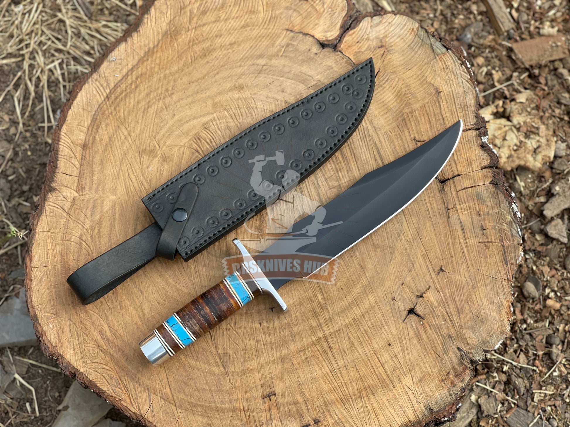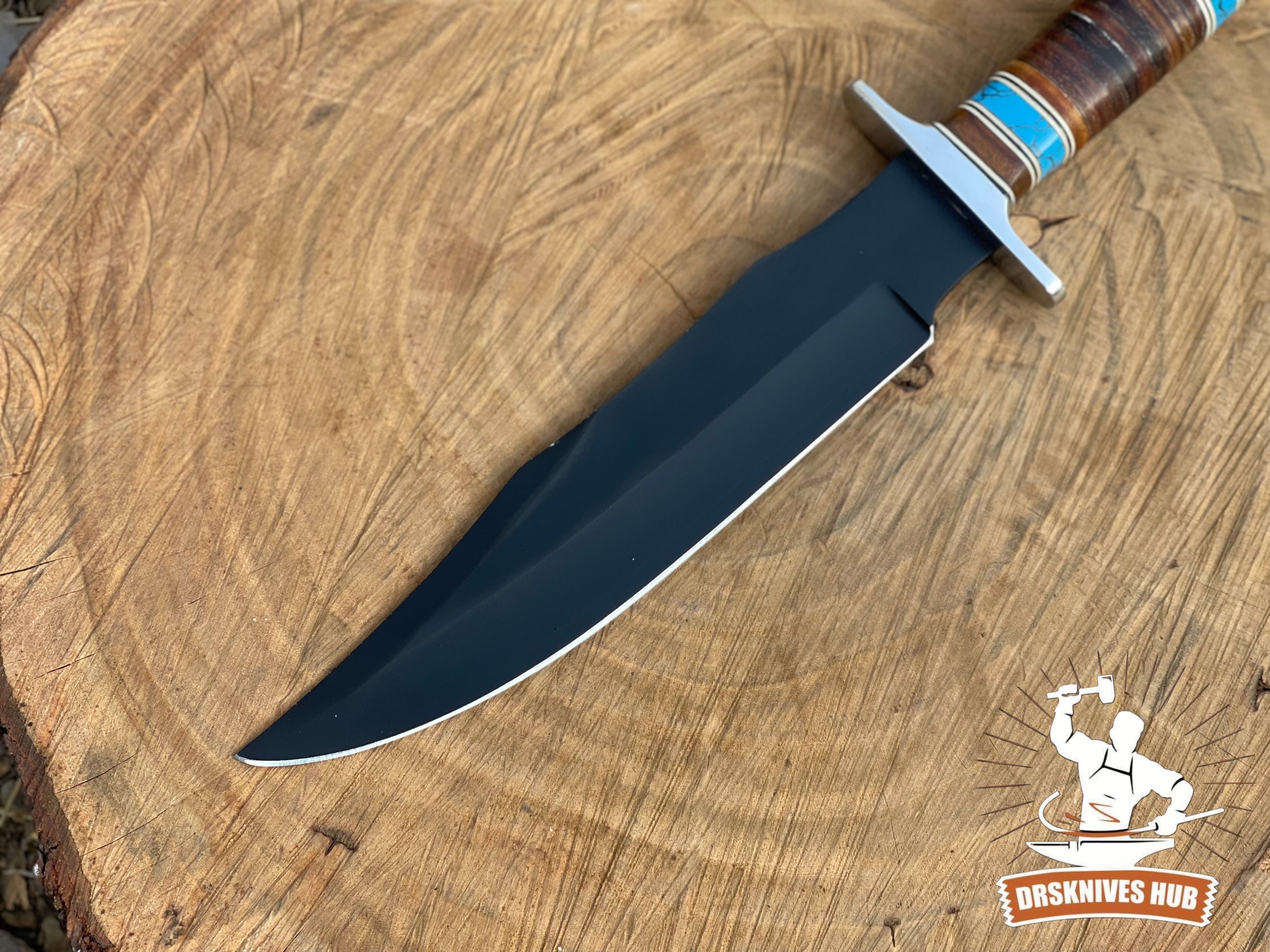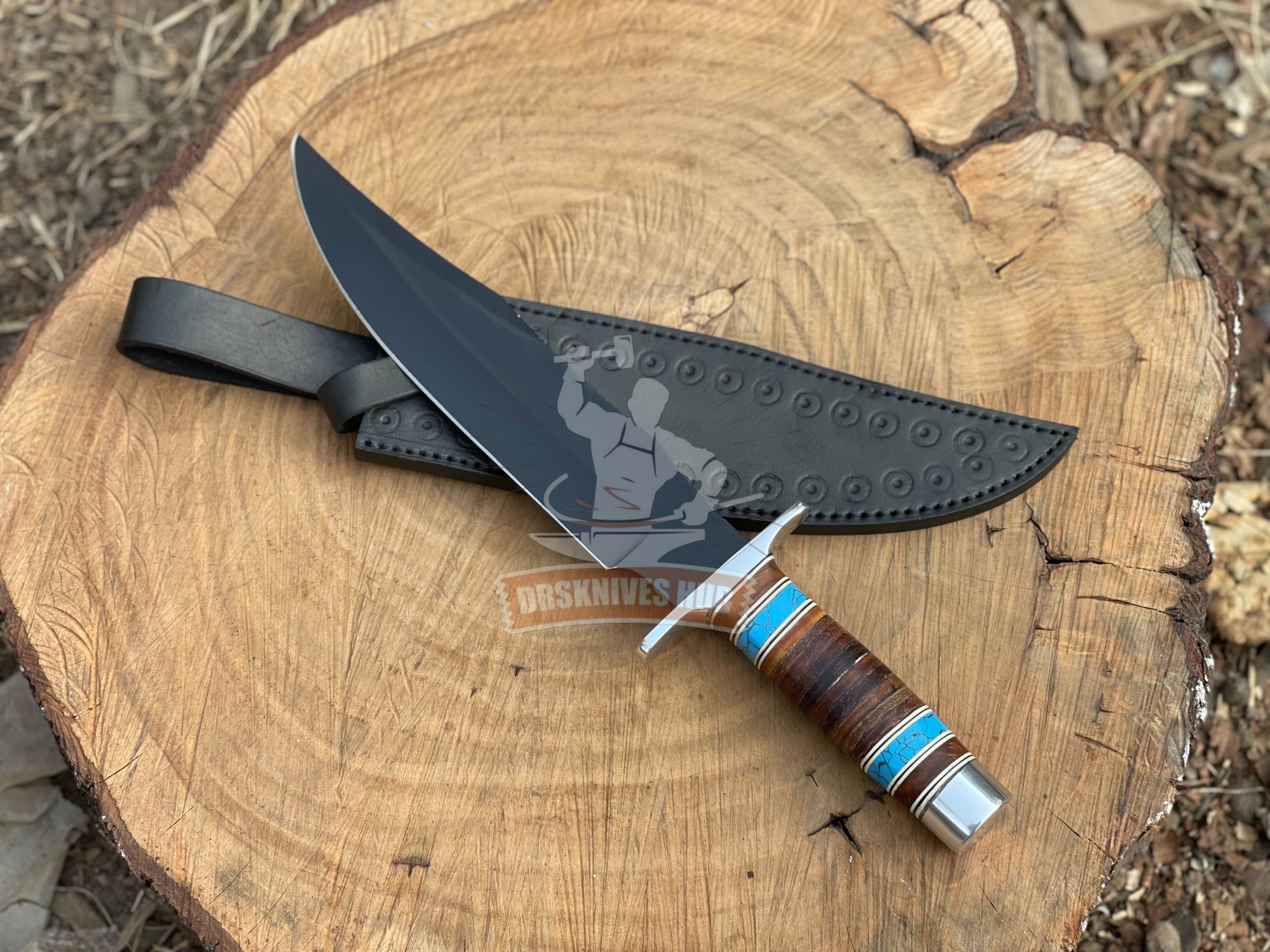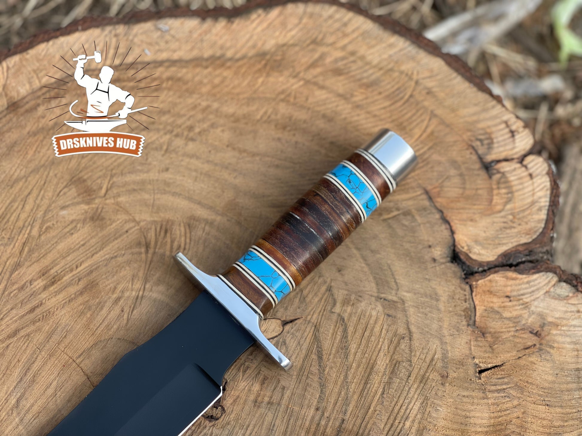 Handcrafted Bowie Knife with Leather and Stone Handle Black Powder-Coated Carbon Steel Blade Leather Sheath | DRSKNIVES HUB