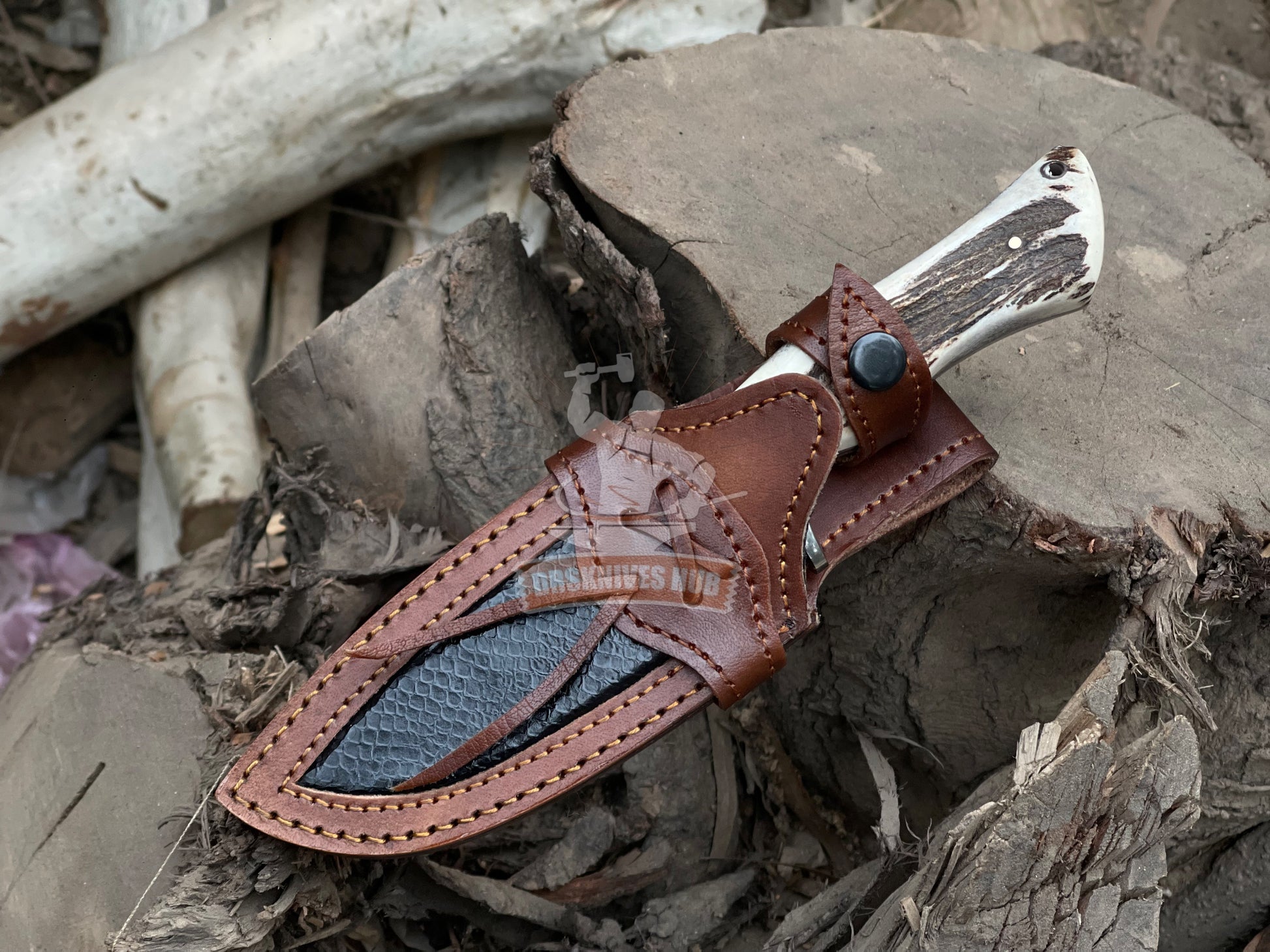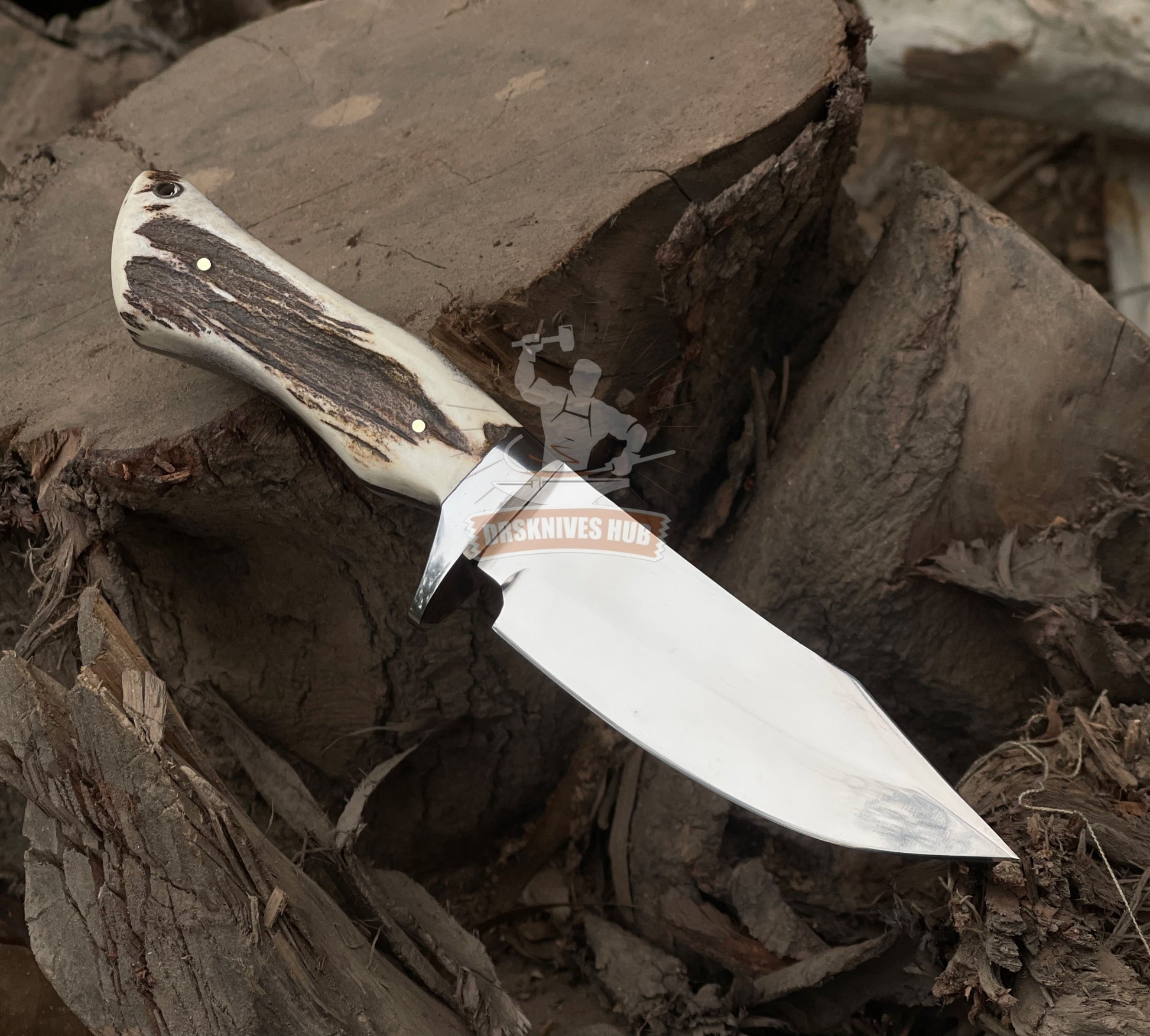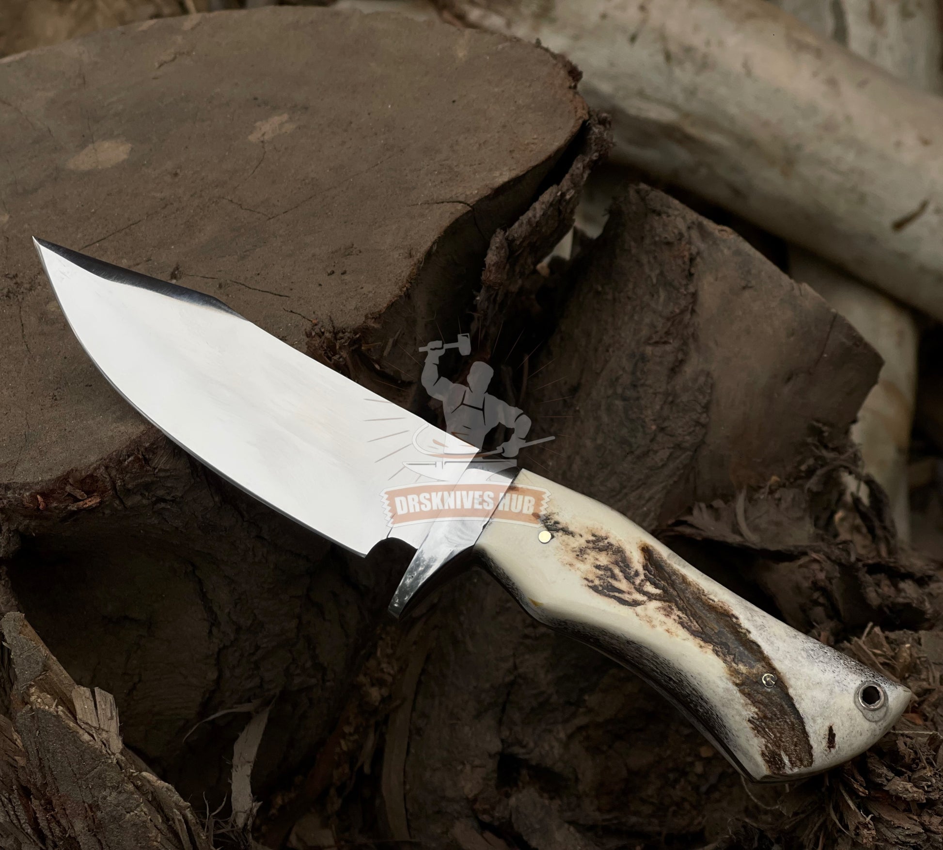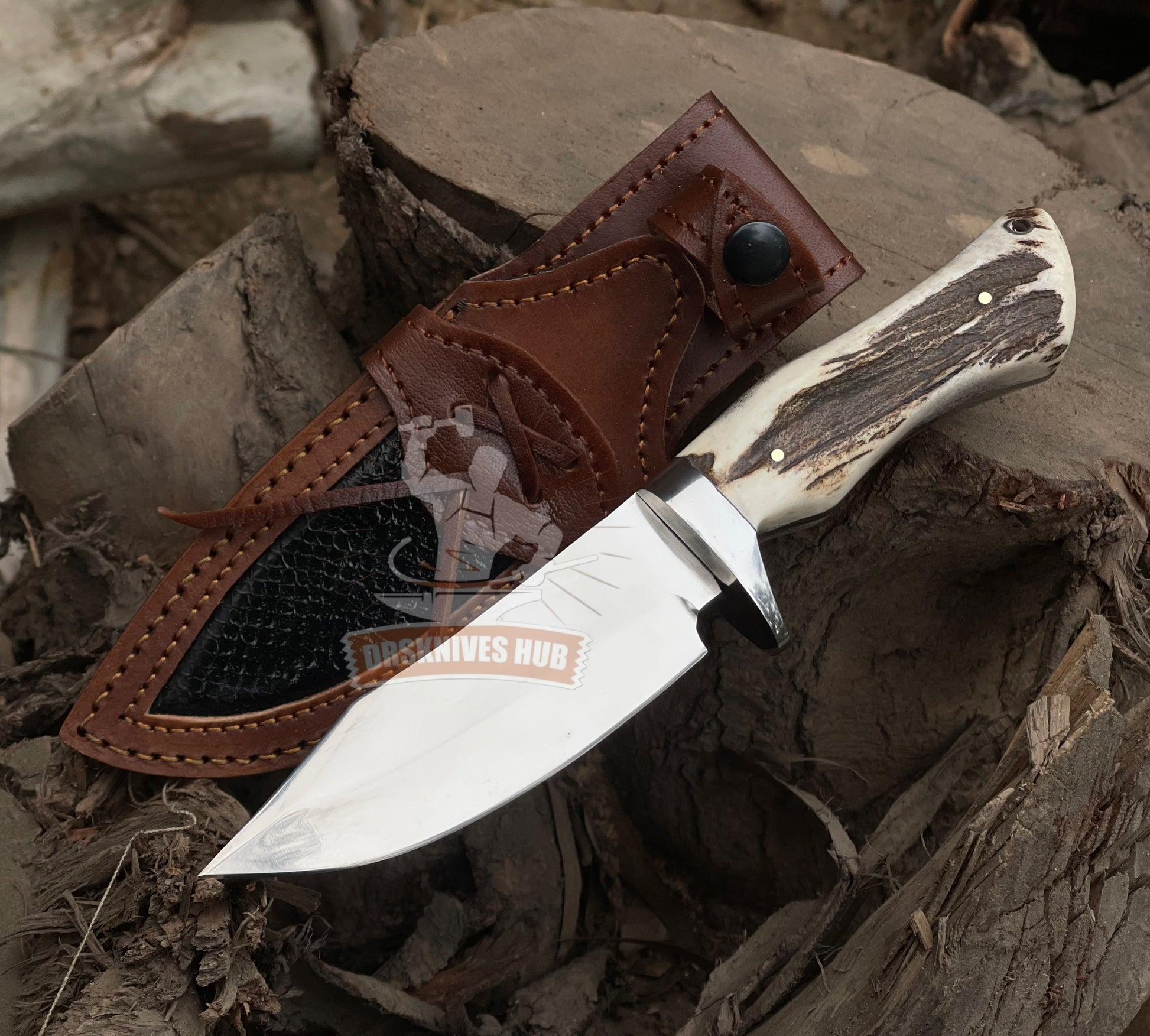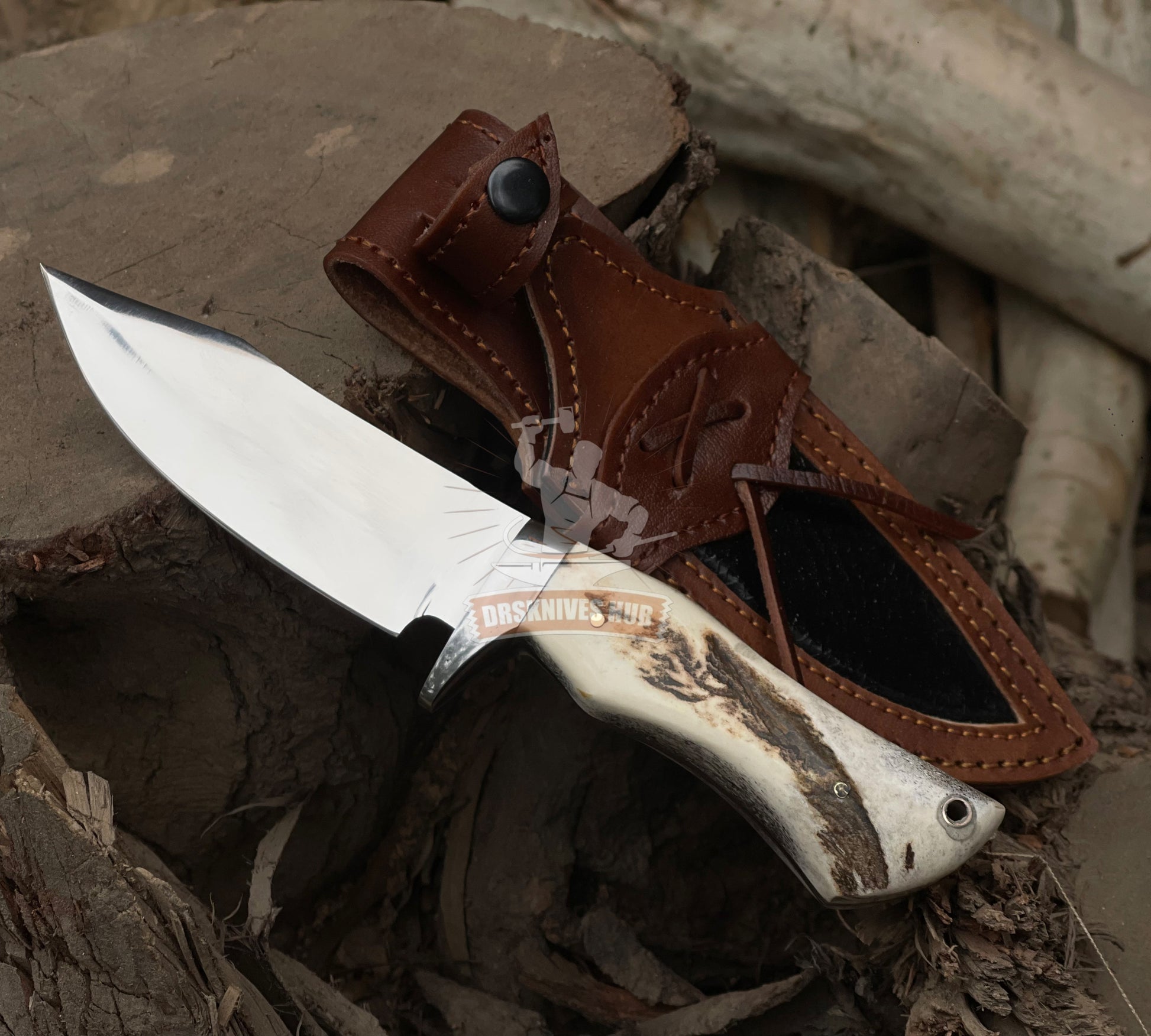 Handmade D2 Steel Hunting Knife: Stag Horn Handle, Leather Sheath