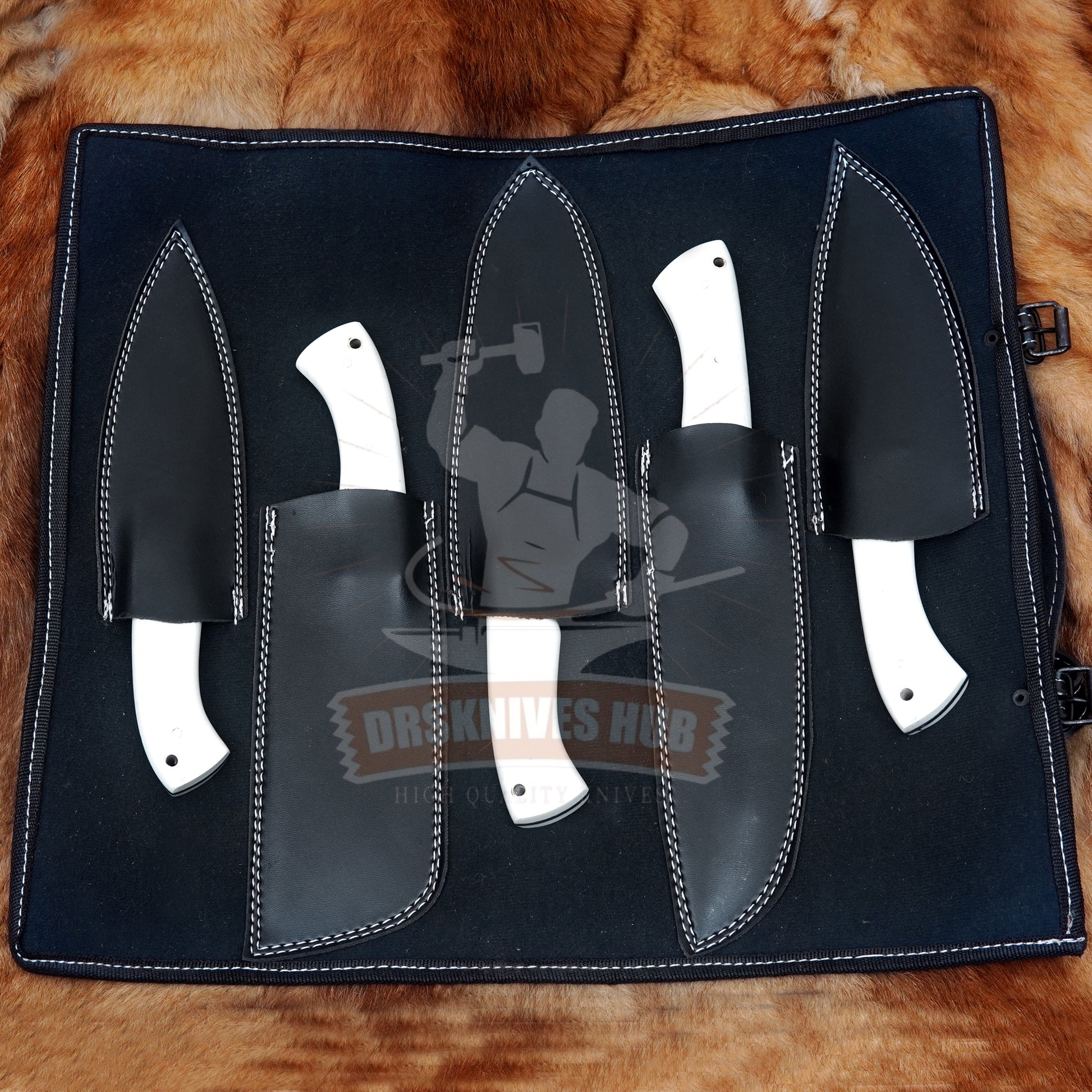 Elevate your kitchen experience with this 5-piece handmade Powder Coated high carbon steel chef knife set, designed for chefs, home cooks, and collectors alike. Each knife features a razor-sharp black blade and a stunning White Resin handle with mosaic pins — combining elegance, durability, and precision.